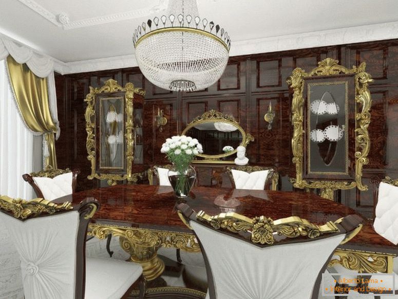 Современиот ентериер на кујната во трпезаријата во приватна куќа, исто така, често има луксузен луксузен дизајн, кој се постигнува преку употреба на темно сјајни мебел, златни метали, природно дрво, луксузни светилки, повеќестепени тавани