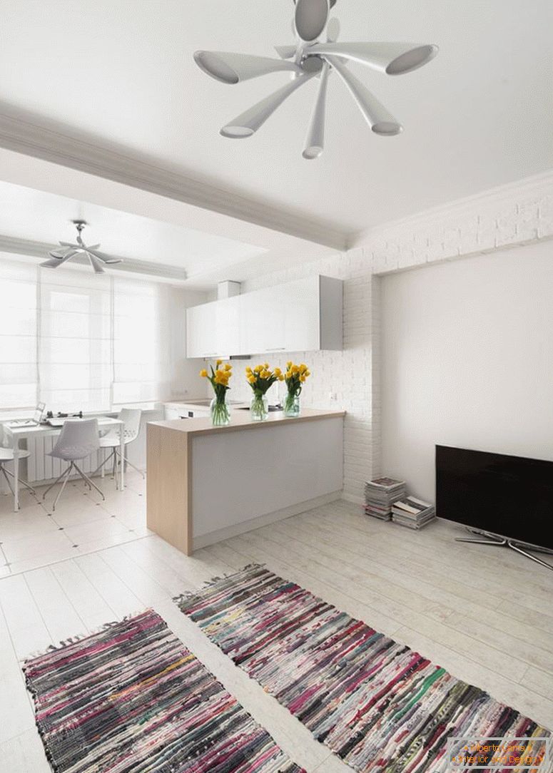Во нивната мала куќа имаше место за мини-кујна, бања и кревет, организирани на ниво на мезанин (висината на таваните во куќата изнесува околу 3,3 м). Исто така постои и мал шкаф, две вградени полици, пишување и трпезариска маса направени од белешки на рекултивираните штици, кои се користеа за завршување на подот.