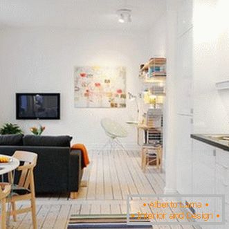 Првично во собата помеѓу дневната соба и кујната беше поделба, која не можеше да биде целосно урната поради нормите на конструкцијата. Сепак, дизајнерите излегоа со идеја да го насликаат во светлосен тон и да го завесаат со завеси, што овозможи да се добие уникатно парче декорација. Тоа е декор е најголемиот плус на ова студио во скандинавски стил. Светла соба е многу пријатна, сака да се врати повторно и повторно.